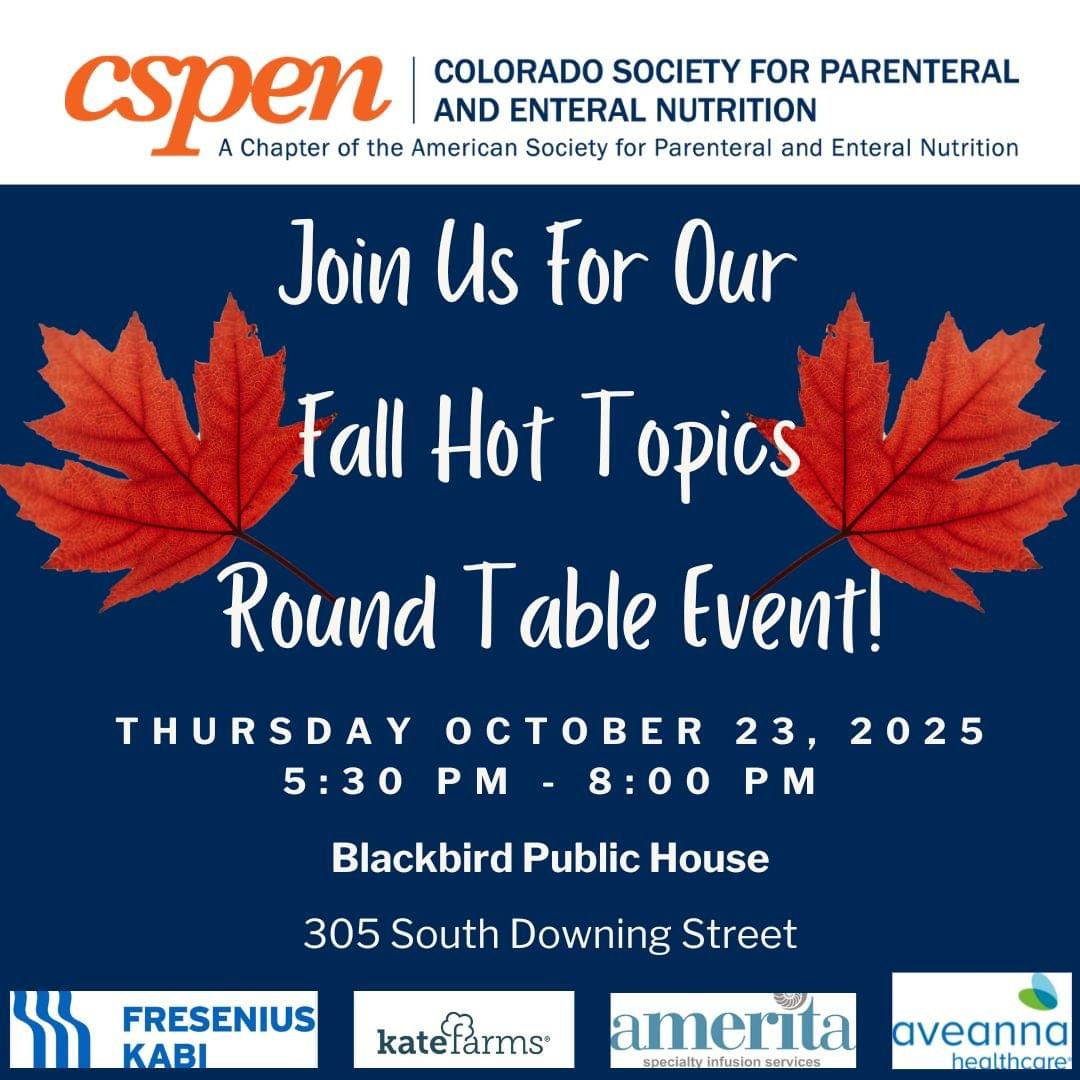 Join us on Thursday October 23, 2025 from 5:30 to 8:00 PM for Happy Hour and a chance to discuss the latest hot topics in nutrition support: